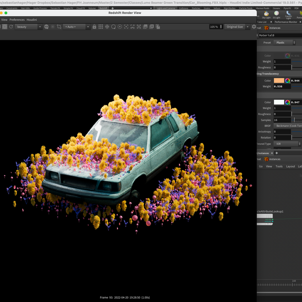 For the Green Transition theme, I wanted to look at plastic and microplastics and created excess waste in the form of a fauna that is now made entirely of plastic. The flowers are made of straws and pet bottles, in extreme colors and shapes. The flowers overgrow the abandoned car, but can not hide the garbage, because they themselves are made of garbage. This reflects our society, where garbage is hidden - aka greenwashing - but actually, nothing is done about the fact that such processes do not change the state of today's pollution.